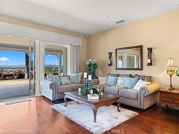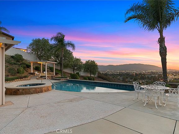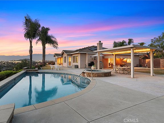 Welcome to your dream single story estate, where luxury meets country charm. Breathtaking 180° west-facing views, offer panoramic vistas of the surrounding mountains and the shimmering city lights at dusk. As you enter, you're greeted by soaring ceilings adorned with exquisite crown molding and elegant French doors that bathe the living spaces in natural light. The open-concept kitchen serves as the heart of the home, flowing seamlessly into the expansive family room—a perfect backdrop for intimate gatherings or grand soirées. Complete with granite counter tops, double ovens, a range, large sink and plenty of storage between the cabinetry and expansive island. Enjoy peace and quiet with separations between the bedrooms and living area. One wing is complete with two spacious bedrooms both with ensuite bathrooms complete with tub in showers. On the opposite side of the home is another secondary bedroom acting as an office and completed with an ensuite bathroom featuring a walk-in shower and the primary suite. This stunning property features a lavish primary bedroom with a lavish ensuite bathroom with double vanities and make up counter, walk-in shower and soaking tub encompassed by travertine tile. Relax in your retreat with comfort and privacy complete with its own inviting fireplace for added allure and direct access to the outdoor space which is equally captivating. A luxurious pool and spa invite you to unwind and soak in the tranquil ambiance of your backyard oasis. Set on nearly an acre of pristine land (41,818 sq. ft.), this property offers ample space for equestrian enthusiasts, with direct access to Norco's esteemed horse trails. Other features of the home include gated RV parking, solar system and grand laundry room with storage, large counter and basin sink. With its combination of elegance, scenic beauty, and modern amenities, this estate is not just a home—it's a lifestyle, offering a serene escape while still being close to city conveniences. Discover the perfect balance between tranquility and luxury in this single story estate with breathtaking views, making this the ideal place to call home.