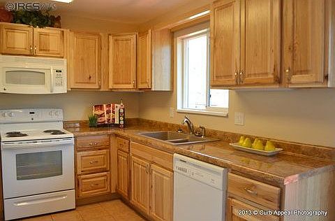 Charm and durability in one beautiful remodel. Open and warm, finished with neutral colors. Hickory kitchen and bath cabinets. Durable tiled entry, kitchen, dining and bath floors. Attractive tile bathtub and shower walls. Brushed nickle hardware. New carpet and paint. Vinyl double pane windows. Two ceiling fans. Huge, freshly painted deck. Privacy fenced yard. Forced air gas heat. Mountain views. Big lower level recreation room. Amble storage. Two car garage. Measurements are approximate.