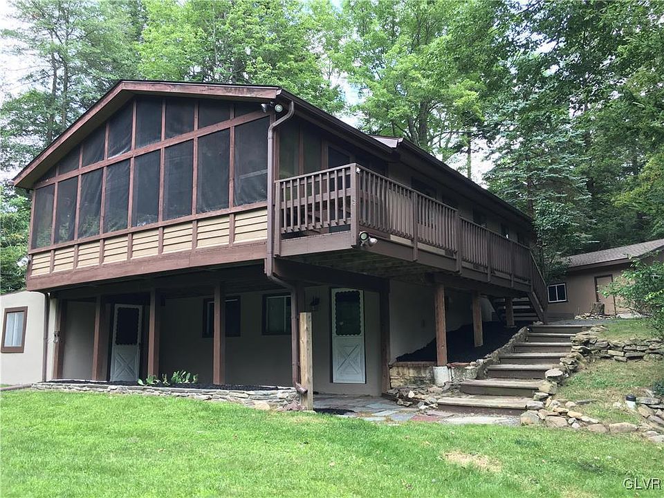 Perfect vacation destination or primary residence. This ranch home tucked back in the woods features an oversized detached single car garage, deck, screen porch with vaulted ceiling, firepit, stream on property, new roof, newly painted exterior, beautifully remodeled custom kitchen with granite counters, glass subway tile backsplash, new matching stainless steel appliance package, vaulted living room/dining room with exposed beam ceiling, original refinished oak wood floors throughout, wood burning fireplace, custom raised panel trim work, crown moulding throughout, new 2 panel doors, remodeled bathroom with custom tile surround and jetted tub, finished lower level featuring ceramic tile wood flooring, 1/2 bath absolutely turn key, close to all Pocono amenities and the lake.
