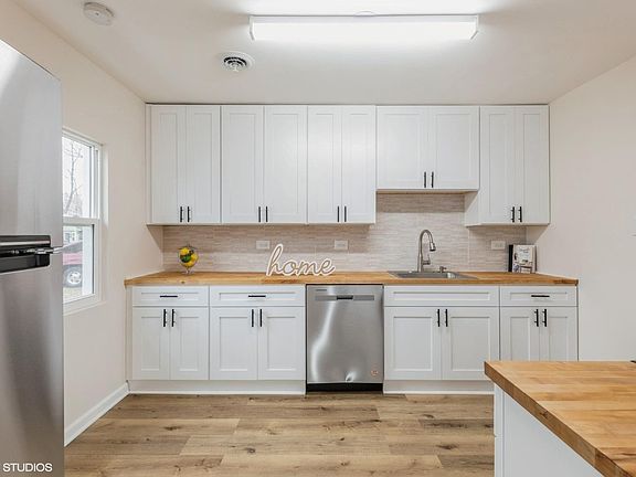 A great opportunity to own your home for less than what you'd pay for rent! This recently renovated solid home features 2 Bedrooms and 1 Bathroom with new kitchen cabinets, butcher block countertops, new hardware and new appliances. There's life-proof vinyl flooring installed throughout and super easy to maintain. Each bedroom includes a ceiling fan, and the bathroom has new a vanity, mirror, lighting, hardware and fixtures plus a large-format ceramic tile shower enclosure with a convenient linen closet. All rooms are freshly painted. Large yard, low taxes, solidly built. This could be your fresh start for the new year! Make this your home today.