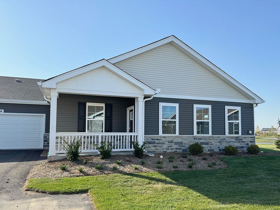 Discover yourself at 1124 Williamsburg Street in Pingree Grove, Illinois, a beautiful new home in Cambridge Lakes North. This ranch townhome is move-in ready. Homesite is low maintenance and includes a fully sodded yard. This Callihan plan offers 1,360 square feet of living space, 2 bedrooms, 2 bathrooms, 9-foot ceilings and a 2-car garage. When you first enter the home, there is a secondary bedroom and full bath with closet space. Down the hall, you will enter the open concept great room and kitchen. The kitchen layout includes a large island with an overhang for stools, quartz counter tops with a stainless steel overmount sink, and smoke cabinetry. Additionally, the main floor includes easy-to-maintain luxury vinyl plank flooring and walk-in laundry room. Enjoy your private get away with your spacious primary bedroom and en suite bathroom with a raised height dual sink, quartz top vanity and walk-in seated shower. Cambridge Lakes North is an ideal location with unlimited conveniences, just minutes from the Randall Road shopping corridor and local restaurants. Residents can easily access Route 47, Route 20, and Route 72, or commute to Chicago in under an hour via I-90, or the Metra train. All Chicago homes include our America's Smart Home Technology, featuring a smart video doorbell, smart Honeywell thermostat, Amazon Echo pop, smart door lock, Deako smart light switches and more. Photos are of actual home within construction process. Model home may vary.