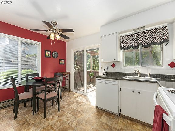 Relax on your large deck & enjoy beautiful views of protected greenspace overlooking Fanno Creek; explore nearby trails that let you enter directly from your unit. Garden in your personal front & side yard, filled with roses, camellias and rhododendrons. An attractive light-filled Great Room with wood-burning fireplace greets you. Beyond is a pretty eat-in kitchen, updated with formica counters that look like granite.  Quiet, sunny end-unit location allows for extra windows. no one above you, no one below, & only 1 common wall between. Located in residential neighborhood of $800,000 homes, convenient to I-217, between downtown & high tech, this unit feels more like a house than a condo. The mini-split heat pump/A.C. keeps rooms cool. Nice neutral carpeting, Well-maintained by the same owner for 23 years. Covered parking, a storage unit, gardening shed & 2 common areas for homeowner use.  All appliances included. Low HOA dues and Washington County taxes. Five parks nearby as well as shopping, & transit. Walk score 74. Bike Score 85. Price includes all appliances. No rental cap.  Pets OK.