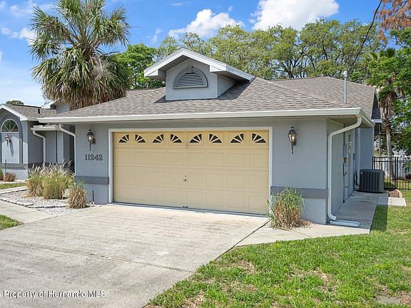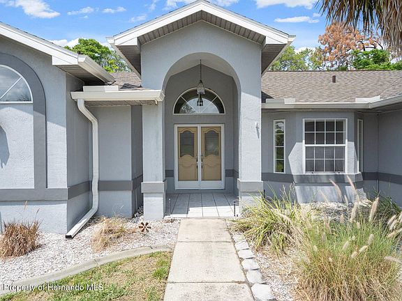 Welcome to this completely remodeled 3-bedroom, 3-bathroom home with a 2-car garage, where modern design meets everyday functionality. Situated on a beautifully landscaped lot, this home features a thoughtfully designed split-bedroom floor plan that offers both privacy and flow. Step inside to discover sophisticated luxury vinyl plank flooring, energy-efficient thermal-pane windows, LED recessed lighting, six-panel doors, modern switches, and stylish ceiling fans throughout—setting the stage for contemporary living. The chef's kitchen is a standout, equipped with quartz countertops, brushed nickel fixtures, a sleek shiplap backsplash, stainless steel appliances, upgraded cabinetry, and a convenient breakfast bar—perfect for both casual meals and entertaining. Retreat to the expansive master suite, a true sanctuary complete with a separate sitting area, and 2 large walk-in closets. The spa-inspired en suite bathroom features a separate walk-in shower, a jetted garden tub, a custom double-sink vanity, and an elegant shiplap accent wall that adds a touch of charm and sophistication. A spacious interior laundry room, and oversized garage add everyday convenience and extra storage. Enjoy year-round comfort with a newer A/C system (2016), a brand new roof (2025), and freshly painted interiors and exteriors. The septic system was pumped in 2020 for added peace of mind. The light-filled living room with vaulted ceilings opens through sliding glass doors to a screened lanai featuring skylights, a ceiling fan, and steps down to your private backyard oasis (wired for a pool) perfect for relaxing or entertaining outdoors. Ideally located near top-rated schools, shopping, dining, hospitals, and entertainment. With easy access to the Suncoast Parkway, you're just a short drive from Tampa, Ocala, and all the Gulf Coast has to offer. This exceptional home blends elegance, comfort, and location into one remarkable package. Don't miss your chance to make it yours!