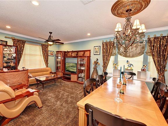- Interior Features: Ceiling Fans(s), Eating Space In Kitchen, High Ceiling(s), Master Bedroom Downstairs, Split Bedroom, Walk-In Closet(s), Crown Molding, Solid Wood Cabinets, Thermostat, Kitchen/Family Room Combo, Living Room/Dining Room Combo, Solid Surface Counters, Window Treatments, Tray Ceiling(s)