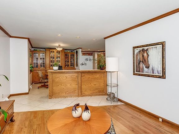Your dream home awaits in this sprawling ranch situated on over a half an acre corner lot complete with a 2 car oversized attached garage + a 4 car tandem detached garage, private inground pool, lovely living room, formal dining area with built-in China cabinet, light and bright kitchen with tile flooring, tile backsplash, cabinets with pull-out shelving, built-in wine rack, and pantry area. Convenient main floor laundry right off the kitchen. Spacious master suite with hardwood floors, built-in dresser, built-in shelving, crown molding, cove lighting, recessed lighting, ceiling fan, large windows, and private bathroom with tile flooring, vanity area, tile shower, whirlpool tub, and built-in linen cabinet. The finished basement includes two spacious bedrooms with walk-in closets, a full bathroom, and a bonus room! Sit back and relax out in the backyard complete with inground pool, patio area, brick and wood fencing, and shed! Hurry this one won't last long!