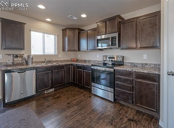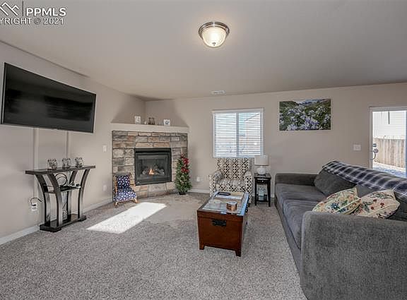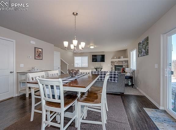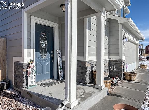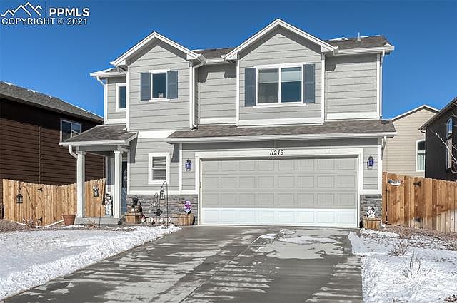 Beautiful Two story home built in 2017 is move in ready and well kept by the original owner! Walk into the home and notice the dark laminate wood floors in the entry. Stone faced gas fireplace will keep your home warm and cozy all winter and give the family room a beautiful focal point. Open kitchen has dark staggered cabinets and laminate wood flooring to match. Kitchen comes with stainless steel appliances and enough room for a large dinner table. Open concept first floor allows the home owner to cook and keep an eye on everyone. Washing clothes has never been easier with the walk in laundry room upstairs located across from the bedrooms. Everyone can be together with all three bedrooms on the second floor. Additional space in the master bedroom is perfect for a home office or cozy reading nook. Master bathroom has double vanity and a large walk in closet. The South facing driveway is bathed in sun much of the time, which is great for helping to keep your driveway clear during the Colorado winters. Enjoy your favorite drink on the back patio and enjoy your fenced in backyard, perfect for any pet. Convenient to military bases, shopping and entertainment. Dont miss your opportunity to see this great home!
