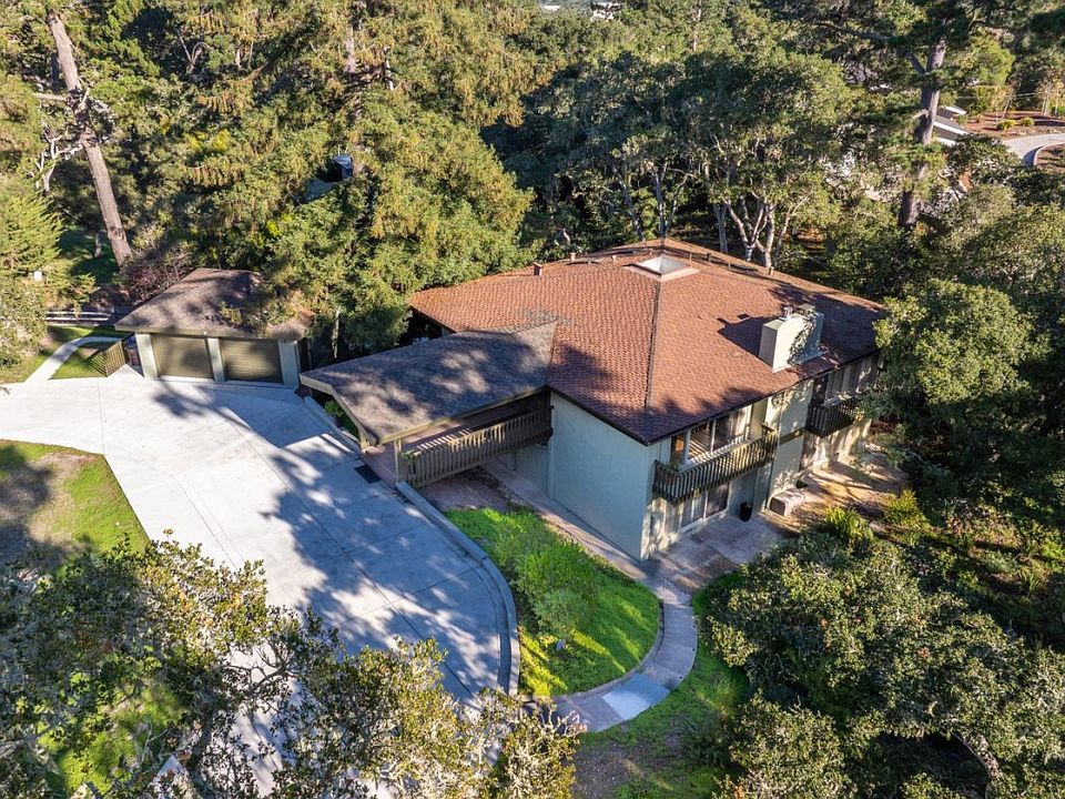 Find yourself surrounded by greenbelt in the beloved, private Alta Mesa neighborhood of Monterey. The distinctive symmetrical architecture of this quiet two-story home surrounds a skylight-topped central staircase. The ground floor features living and dining areas with built-in bookcases, a large eat-in kitchen and the main bedroom. Three balconies and four skylights provide enchanting views of the forest environment. The lower level comprises three bedrooms, a family room/office, laundry, storage/hobby and mud rooms. Fireplaces on each floor add warmth, with an efficient gas insert in the main bedroom. Abundant storage includes overhead and sub-floor compartments. The location is ideal - less than a half-mile from Del Monte Center and under a mile to downtown Monterey and the beach. Its 29,000+ sqft rounded corner lot offers abundant foliage, with mature redwoods, oaks and pines. It has had many upgrades over the last few years.New driveway and two-car garage, remodeled frontage, drought-tolerant landscaping, kitchen and lighting work, tankless water heater, water filtration/softening, multi-camera security system, and bamboo flooring throughout. The exterior and most of the interior were just painted. There is plentiful parking on a wide, 180-foot long semicircular driveway.