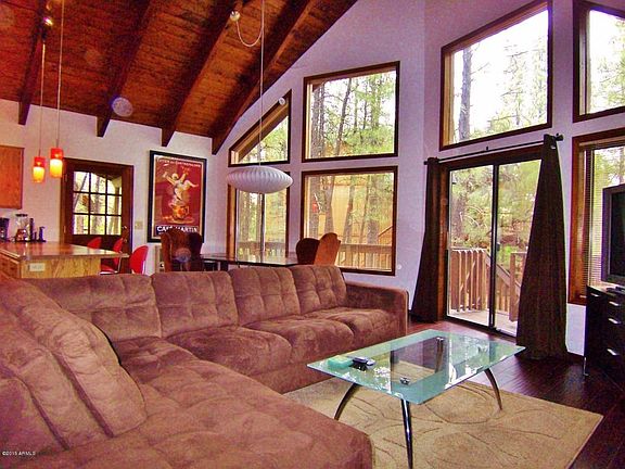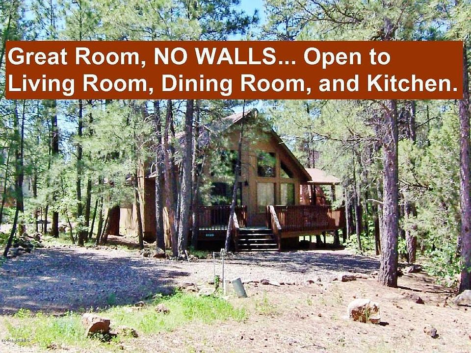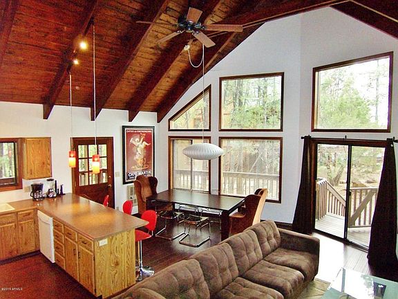 Just 15 miles south of Flagstaff, via I-17, you will find this Munds Park cabin with its open and spacious great room which combines the living room, kitchen, and dining room into one huge room with no walls. The great room has a cathedral ceiling, soaring windows, and a wood-burning fireplace. Upstairs has one bedroom, a walk-in closet, and full bathroom. The main level has two bedrooms and a bathroom with a tub/shower combo. The flooring, countertops, appliances and water heater have all been recently replaced. Located at the end of a cul-de-sac close to national forest. Munds Park has paved roads, winter access, water, and sewers. Appraiser states total under roof Sq. Ft. is 1222 (including 42 Sq. Ft. with less than 5'' ceiling). The furnishings can be included with an acceptable offer.