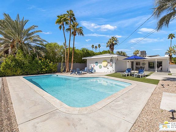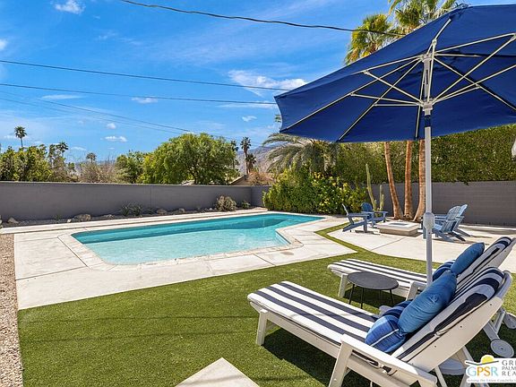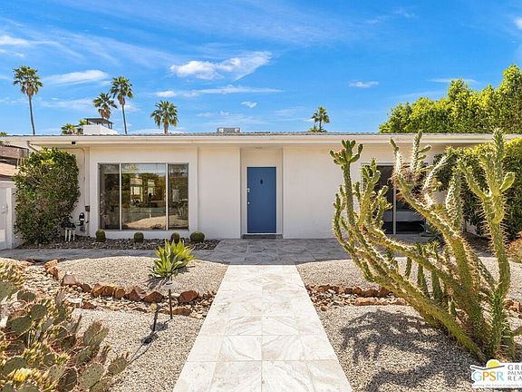 Stylish mid-century modern detached home in the highly sought-after Movie Colony East neighborhood offers a perfect blend of style, comfort, and sustainability. Featuring modern finishes both inside and out, the home boasts a large, south-facing backyard with a refreshing pool and generous mountain views. With owned solar panels and a Tesla Powerwall, this home is as eco-friendly as it is beautiful! From the moment you arrive, the home's curb appeal is sure to impress. Step inside to a light-filled living room that highlights panoramic mountain views, gas fireplace, and porcelain tile flooring that flows seamlessly into the modern kitchen and dining area. The kitchen showcases high-gloss cabinetry, sleek quartz countertops, and a stainless steel appliance suite, including a gas range and built-in beverage cooler. Plus, the easy access to the covered patio and ultra-private backyard makes outdoor entertaining a breeze. Outside, the expansive backyard features a large pool, framed by mature palm trees and stunning mountain viewscreating an ideal setting for relaxation and entertainment. The covered patio provides the perfect space to enjoy the outdoors in complete privacy. The spacious primary suite includes two closets, a sliding glass door leading directly to the backyard, and an ensuite bath with a walk-in shower. Bedroom Two offers direct access to the private front yard and is conveniently located near the hallway bath, which includes both a walk-in shower and separate soaking tub. For added convenience, the home also includes an inside laundry area. With its desirable location, exceptional upgrades, and sustainable features, this is truly a must-see home!