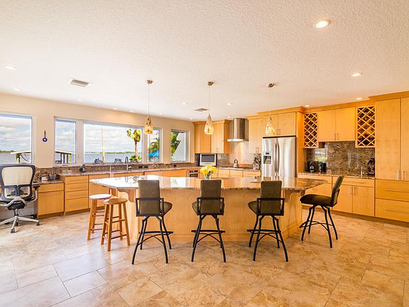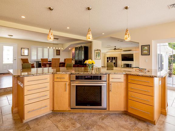 Showcasing the Florida Intracoastal lifestyle, this 3,045 sqft waterfront estate w/saltwater pool sits on nearly 1/2 acre, featuring 4 bedrooms and 3 full bathrooms. Chef-styled kitchen has stainless steel appliances, incl an oversized Thermador oven and 5-burner range top, custom all-wood, ceiling height cabinetry w/lower cabinet and double trash pull-outs, granite counter tops, wet bar, built-in wine racks and so much more. Oversized master suite offers complete privacy as its own wing of the house, boasting many architectural details. Master bath has dual vanities, custom cabinetry, stone countertops, walk-in shower and separate toilet area. Family room sliders open onto stunning 1844 sqft Azek deck; Covered boat house and dock w/seated bar, refrig, water, and electric. Home rebuilt in 2008 w/new electric, impact resistant windows, dual-zoned AC, walls, doors, Plantation shutters, and roof. Propane installed for on-demand water heater, cooktop, and BBQ. SO MUCH MORE!! COME SEE TODAY!