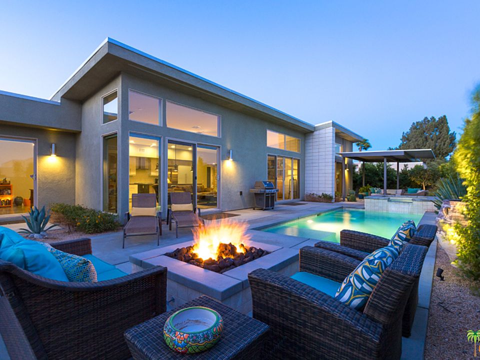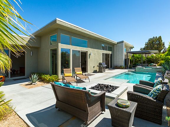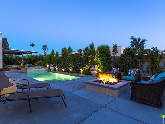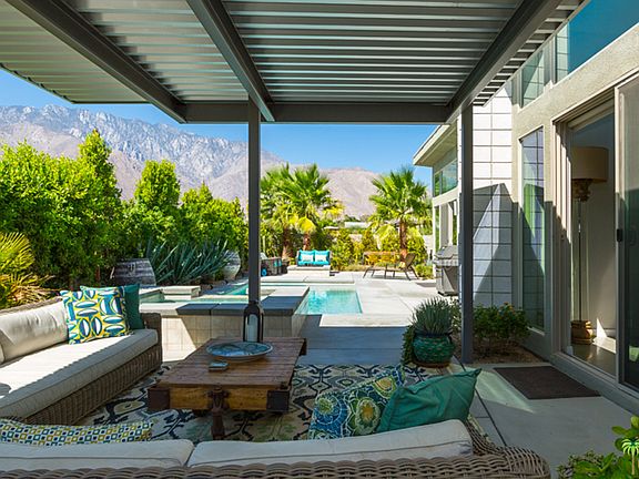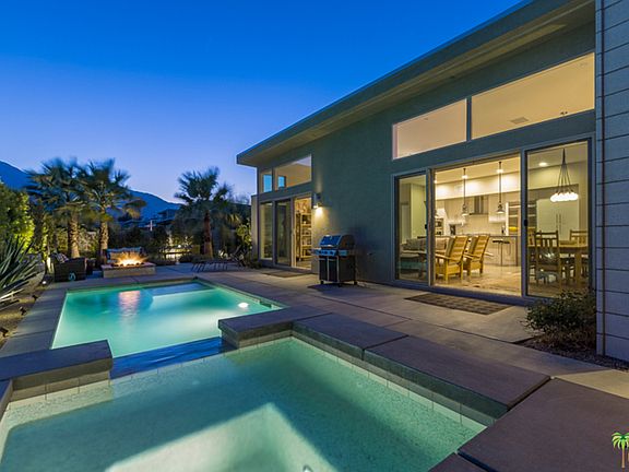 Brilliant architecture with green construction, energy efficient systems, and modern finishes positioned on a lot that offers incredible views makes this one a winner! No HOA and priced below the last sale, too! High ceilings, floor to ceiling glass, modern cabinetry with quartz counters and concrete/tile flooring throughout. Modern kitchen with Bosch appliances and large great room open to the south-facing backyard that delivers views, Pebble-Tec pool and spa, fire pit, and multiple citrus trees. Master Suite has views, access to the south-facing pool/spa, walk-in closet and spa-like bath with dual sinks, large walk-in shower, and separate soaking tub. Junior Ensuite Two, which is on the other end, also has views, access to the south-facing pool/spa, and a private bath. Bedroom Three, near the front of the house and adjacent to a full bath, has a private patio and views of Mt San Jacinto and Big Bear. Solar panels, high-efficiency HVAC units, tank less water heater and more!