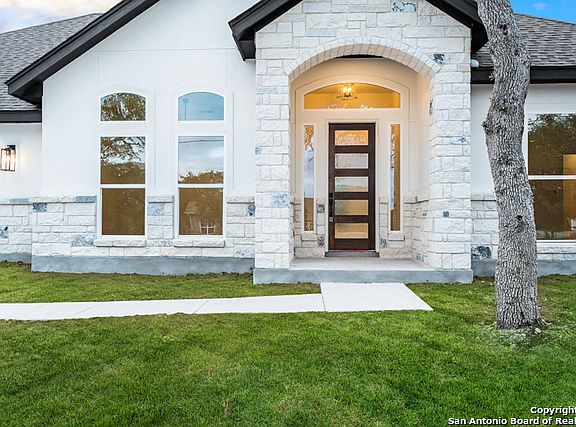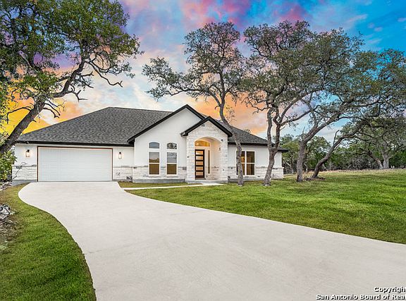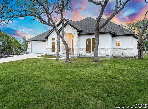 Great opportunity to own this beautiful 3 bedroom, 2 bath one-story home in The Legends at Rancho Del Lago. The home sits on an acre lot, and the backyard features a covered patio with beautiful hill country views within minutes of Canyon Lake. The open layout home will feature high ceilings, custom shaker cabinets, granite countertops throughout the house, walk-in closets, and recessed lighting. The kitchen will include Stainless Steel appliances, a nicely sized island, + tile backsplash. (DISCLAIMER: The grass is photoshopped to enhance the photos.)