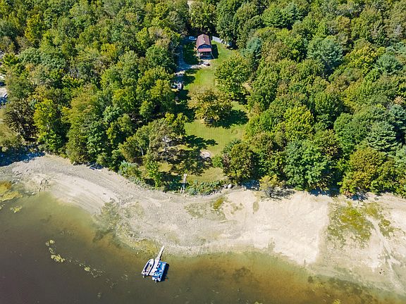 Experience lakeside living in this private year-round home set on 3.2 scenic acres with 405 feet of waterfront on Graham Lake. The first floor features a modern kitchen with quartz countertops, a cozy dining area with built-ins, a comfortable living room with porch access, a bedroom, and a full bathroom with laundry. Upstairs, you will discover two additional bedrooms, a bathroom, and office space. Enjoy outdoor living with a gazebo by the shoreline, a storage shed, a covered porch, and a walk-out basement with a patio and hot tub access. Additional features include a generator, a pellet stove in the basement, a dock, and a backyard privacy fence with additional parking space. The inviting yard is ideal for family fun and offers easy waterfront access.