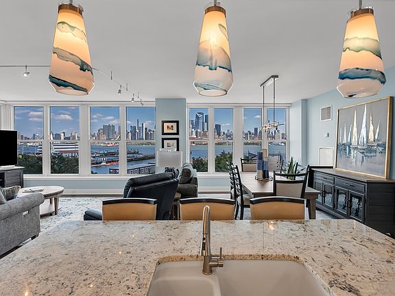 Discover luxurious living with breathtaking NYC and Hudson River views from every room in this stunning 1,752 sq ft corner residence at Maxwell Place, Hoboken's premier waterfront community. This spacious home features one of the most sought-after layouts among waterfront homes, with 2 bedrooms, 2.5 baths, and a private balcony. The upgraded kitchen boasts top-of-the-line cabinets, granite countertops, a custom backsplash, and stainless steel appliances, all complemented by expansive windows offering panoramic views. Hardwood floors flow through the living and dining areas, perfect for relaxation and entertainment. The primary suite accommodates a king bed and includes his and her closets with custom organizers, while the second bedroom suite also fits a king bed and features a private bath and walk-in closet. Exceptional amenities include 24-hour concierge service, two gyms, landscaped roof gardens with BBQ areas, fireplaces, and TVs, two pools, a community room with NYC views, conference room, and a theater. Conveniently located near ferry and bus stops with a private shuttle to the PATH and on-level parking, this home offers the ultimate in luxury and convenience. This residence is a must-see!