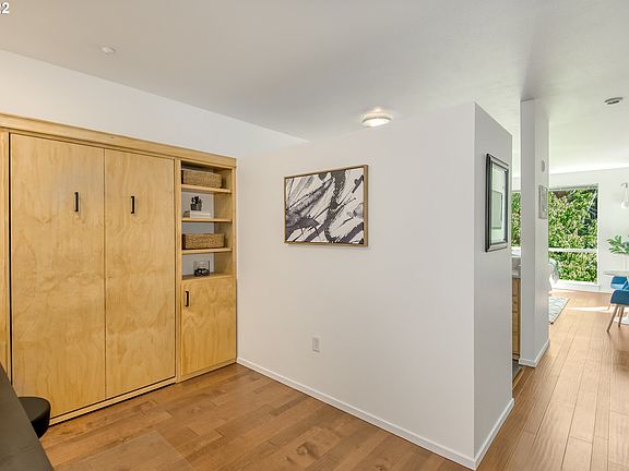 Contemporary and bright condo in the lively Pearl District located across from Tanner Springs Park. Lexis on the Park is a pet-friendly building with a walk score of 97 and bike score of 99. Kitchen with eat-in bar opens to living room with large windows and balcony. Spacious bedroom has large walk-in closet with built -in organizers. Features a den/flex space with custom Murphy bed, storage, and desk with cabinetry matching the kitchen. HOA includes meeting room, gym, water, sewer, and garbage.