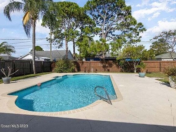 BACK on the market!!!!! This beautiful pool home in the heart of the city of Palm Bay, pool was resurfaced in 2019 with an over-sized pool deck, large fenced-in back yard. Remodeled kitchen in 2022, new lighting, hurricane impact windows, split floor plan with plenty of natural light! BACK on the market after renovations: (2023) NEWLY installed flooring in bedrooms and paint!