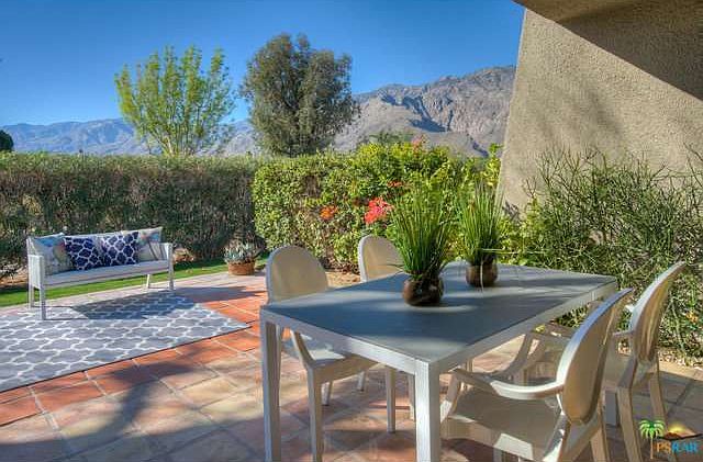 A very lucky someone will scoop up this updated Wexler designed unit at fabulous Rose Garden! Not only is it on fee land, it's one of the best views in the complex, with in-your-face western and southern mountain views from the privacy of your own back yard, with an extended tiled patio and tall hedges of bougainvillea and oleander. There's an enclosed and tiled courtyard,and inside a clean, updated, contemporary dwelling. 18" tile runs through the main living area, with new carpet in both bedrooms, which have sliders out to private patios.The roomy master bath has a new, mod double vanity with quartz counters and walk-in travertine tile shower with rain glass doors. The kitchen has nice wood cabinetry, gas range with griddle, built-in wine rack and microwave, and French door fridge.A full size Kenmore washer and dryer are convenient in a hall closet. The roof is 2 years new and all windows and sliders are new and dual paned. The quiet of this complex is broken only by singing birds!