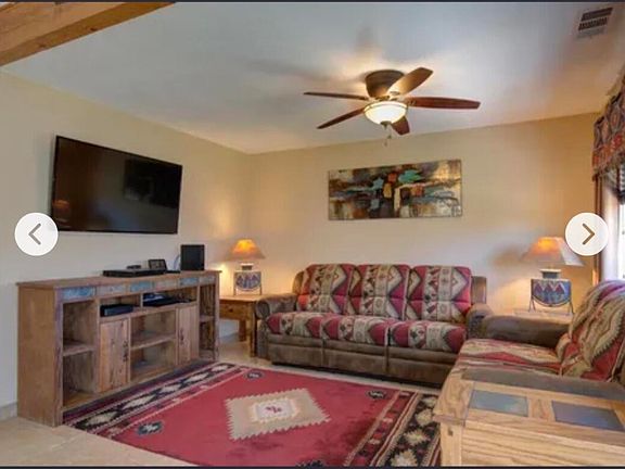 Charming 4 bed, 2 bath Southwestern home with strong rental history and excellent condition. High-grade granite, oak doors, ceiling fans in all rooms. No neighbors behind -- just open space, a serene bird migration corridor, and trout-stocked waterway. Fully fenced 0.2-acre lot with electric gate, oversized rear access, and RV pad. Includes a two-story studio/workshop with upper-level views. Underground utilities, lush lawn with sprinkler system. Minutes to Rail Runner. Located in a town known for festivals and close to area film studios.