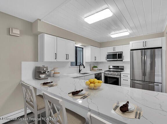 Minutes to the Open Bay! Get ready for boating fun! Fantastic 3 or 4 Bedroom waterfront home on 75 ft of vinyl bulkheading with dock, all on private location where you never have to see your neighbor across the lagoon from you! White shaker kitchen cabinetry, 4 stool quartz breakfast bar, Planked ceilings plus stainless steel appliances all with open plan architecture. letting you entertain as the home flows with double patio doors where you can easily carry the party right onto the decking and paver patio area all overlooking the private waterfront area. Master Bedroom with full bath on lower level plus second bedroom and 1/2 bedrooms on lower level. Up are 2 Beds with one having balcony overlooking water and shared full bath. New gas hwbb heat and c/ac plus oversized garage. . Short boat ride to open water and minutes to the beaches at LBI. Homes digitally staged for illustrative purposes only