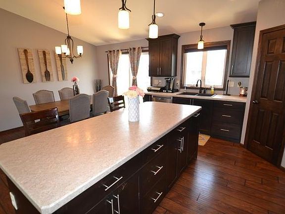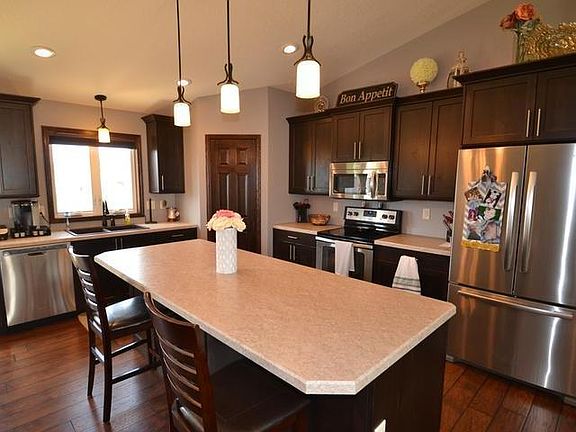 Enjoy this 'better-than-new' 2013 home in north Bismarck with hardwood finishes, HUGE kitchen island, alder cabinets, and UPGRADED Whirlpool appliances. The upper level offers an open-concept living/dining/kitchen area along with oversized master bedroom/suite, a second large bedroom, a full bath and MAIN FLOOR LAUNDRY. Imagine entertaining your guests on the 16x12 deck with maintenance free handrail overlooking the HUGE BACK YARD!! The garage is oversized and heated with water and floor drain. This is a must see! Call your favorite Realtor today for a showing.