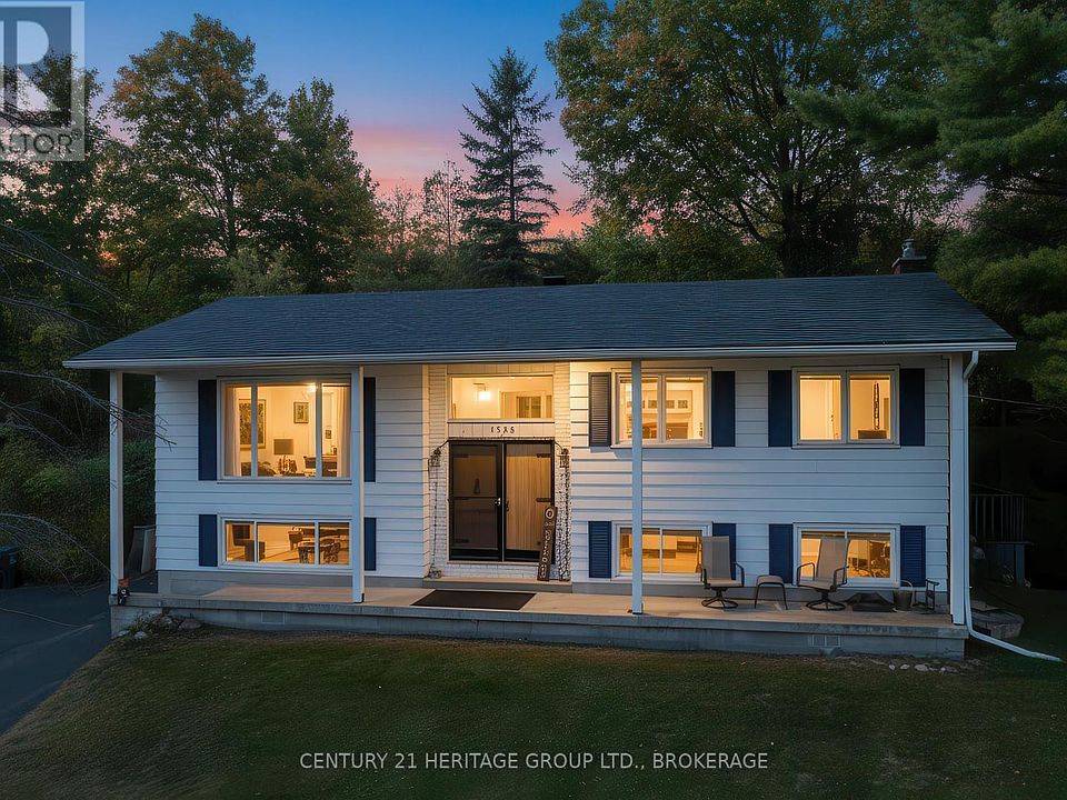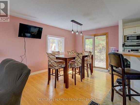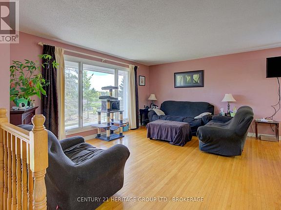 Nestled just minutes from town, this charming home sits on an extra-wide, treed lot offering both privacy and serenity with no rear neighbours. The property spans nearly an acre of wooded land, providing the perfect balance of natural beauty and convenience. Step inside to find gleaming hardwood floors and a bright, open-concept layout that seamlessly connects the kitchen, dining, and living areas, ideal for everyday living and entertaining. The dining room features a charming garden window, filling the space with natural light, while a garden door opens onto a spacious deck overlooking the tranquil backyard. The home offers two generous bedrooms on the main level (originally three, easily converted back if desired) along with a kitchen and mostly newer windows throughout. Downstairs, the cozy rec room is anchored by a gas fireplace, creating a warm and inviting atmosphere, and an additional large bedroom with its own gas fireplace provides versatility for guests, family, or a private retreat. Outside, the expansive lot is dotted with mature trees, offering both shade and privacy, and includes a detached garage for additional storage or workshop space. This property combines the best of country living with the convenience of being close to town, an ideal retreat to call home. (id:41440)