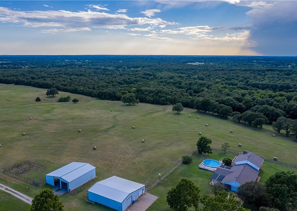 This beautiful homes sits 1/3 back on the property behind mature oaks overlooking the front and back pastures. Back pasture topography is begging for a large pond to be built and is set up perfectly for this. Outside the home you will find a 50x50 shop with concrete floors and 220 electric for welding along with 110 outlets everywhere. There is a separate 45x50 barn perfect for storing tractors and trailers. Small pond in front pasture. The home is 3,871 Sq Ft. tri-level. Lower level has a massive den perfect for entertaining and also has a wood burning fireplace. Next to lower level den is a bedroom with full bath that can also be a study. Main level has Kitchen with dining room off to side along with a breakfast nook. Main living with utility and half bath also on the main level. Upstairs is a Master with full bath and walk-in closet along with two other bedrooms that share a full bath down the hall. 28' diameter above ground pool with deck! Too many things to list! New carpet!