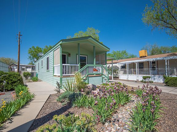 Very spacious 840 square foot single wide manufactured home in Orchard Ranch, a 55+ community. Great floor plan! Kitchen includes abundant counter and cabinet space, with pantry and under-counter lighting. South facing living area with generous light, opens to front covered porch with protective sunscreens providing a gentle breeze overlooking a landscaped garden. Of the 2 bedrooms the large master with double closet can accommodate a king size bed and wide dresser. The 2nd bedroom with closet is perfect for an office, craft room or single bed. Handicap accessible bathroom includes tub, shower, raised toilet, and skylight providing natural lighting. Laundry hosts energy efficient washer, dryer, plentiful cupboard storage, and drying rack. Easy to clean, energy efficient windows throughout the entire house are warrantied for life. Central air and forced heating in an all electric home. Natural gas is available. Lengthy carport will accommodate 2 full size cars and 1 golf cart. Insulated storage shed is equipped with work bench, 2 windows, and loft storage. Near to Prescott Valley and Prescott with lots of things to do, including shopping malls, great resteraunts, beuatiful hikes, and many lakes to choose from to fish, paddle board, kayak, canoe and enjoy all of the great seasons. Lot leases for $400 per month that includes aquatic classes, billiards, bingo, bunko, cards, community raised gardens, exercise room, horseshoes, hot tub, swimming pool, library, line dancing, pickle ball, sewing room, and wood shop. Orchard Ranch is known for friendly neighbors, summer community social events, shade from mature trees, well maintained roads, clean air, nearby hiking, kayaking, and shops close to the surrounding area. "AS-IS" seller is not willing to make any repairs. To get financing on this home contact Courtney Younger at (928)848-8643.