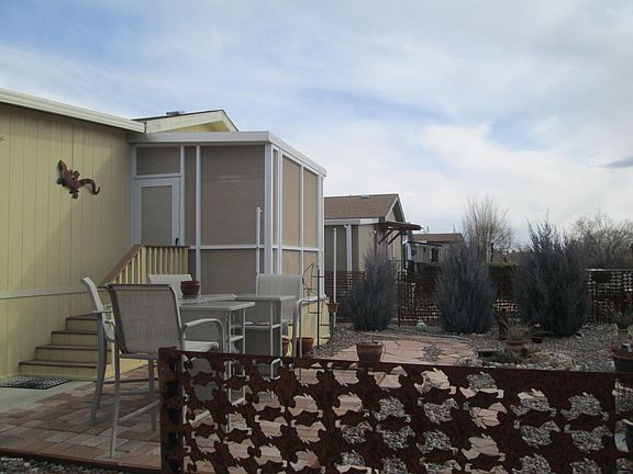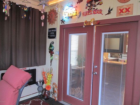 Laminate floors throughout the home with exception of bedrooms being carpeted. The front porch has been insulated and screened with additional a/c unit. Entrance has beautiful french doors from the front porch into the living/dining area. Back porch is screened and you have no home behind and has a great patio area for seating and fencing. Buyer has to have background check and be 55+