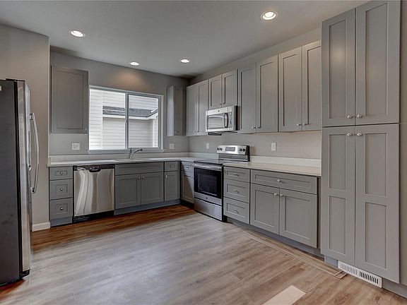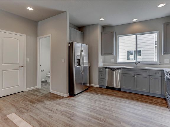 This development features 4 available floor-plan options that are town-home style condo's with 3 levels. A two car garage with 2 garage door openers are included. When you enter the home from the garage you go into the large mudroom with a large storage closet and handicap accessible 1/2 bath. The 2nd floor is the main living area. This is so spacious with an open floor-plan. The kitchen boasts 42" upgraded kitchen cabinets. Stainless Steel kitchen appliances are included. The main floor features laminate wood flooring upgraded throughout. The spacious living room walk's out to a covered deck. The 3rd floor features all the bedrooms. The master bedroom has his and her walk-in closet, a 5 piece master bath, and walks out to your very own private balcony. The upper level has a full bathroom with tile floors and tile bath surround. The laundry room is conveniently located upstairs by the bedrooms. The community features an outdoor pool, basketball court, playground and walking trails.