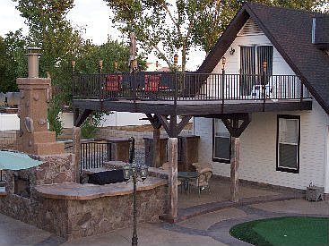 This custom estate sits on over an acre of land and has been designed for both family and entertainment - from the inviting front porch and spacious interior, to the resort styled rear yard. The front of the estate is beautiful with custom wrought iron & lit column fencing containing two entrances each having enormous dual swinging gates. The property features so many amenities we can only list a few here: Large entry with dormer window, beautiful Dining room complete with chandelier, matching wall sconces and accent lighted crown molding, the Great Room which features a magnificent wood burning fireplace flows freely into a kitchen designed for the family chef as well as entertaining. This well appointed kitchen features granite counter tops, full tumbled stone back splash, stainless steel appliances, abundance of cabinetry with self closing drawers, roll out cabinet drawers, turn style corner cabinet, finished with crown molding and under cabinet lighting, there’s even a custom island. The homes split floor plan design gives privacy to a master suite with French doors, crown molding, a coffee/wine bar, large walk in closet with custom shelving and a spacious bath room which includes a Jacuzzi tub, full tiled shower, large mirrored vanity with dual sinks and tiled top. There are expansive views of the homes rear yard from the master suite, Great room and Kitchen via two sets of French doors and large picturesque windows. The East wing of the home has a large laundry room, two more bedrooms, a full bath room and access to the upstairs bonus area which is suitable for many uses. The bonus area also gives access to the upper terrace deck for an impressive view of the property’s rear grounds, private dining, sun bathing and beautiful sunsets. The rear of the home has a full length covered patio with custom rock and log designed railing which leads down to the putting green, casita and entertainment area. The 875 square foot casita/guest house has a full length cust