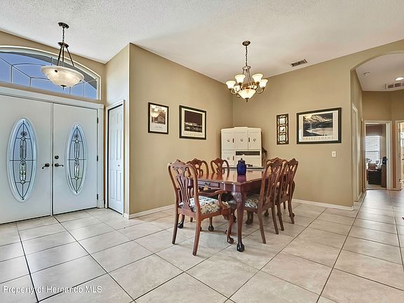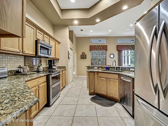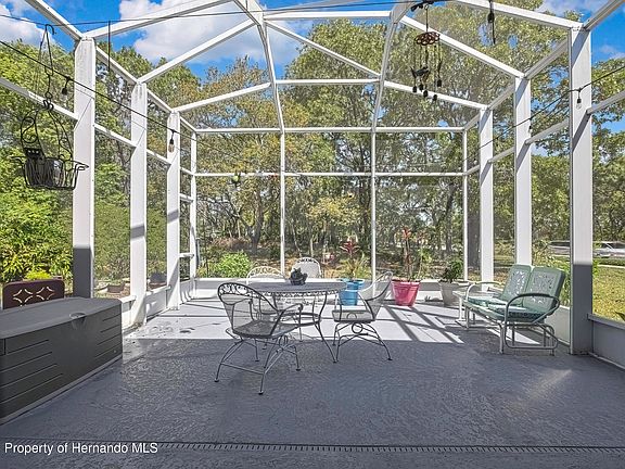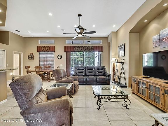 Welcome to this beautiful 4-bed, 3-bath, 3-car garage Remington model home, perfectly situated on a desirable corner lot in The Wellington at Seven Hills. With exceptional curb appeal, an extended driveway, BRAND NEW ROOF (June 11, 2025), and an elegant double-door entry, this home is designed to impress from the moment you arrive. Step inside to a layout which includes a flex space which could be a den, office or formal living area and a separate formal dining room that showcases tasteful architectural details including rounded corners, custom cornices, decorator lighting, and soaring flat ceilings. Gorgeous 20-inch ceramic tile flows throughout, creating a seamless connection between the formal and informal spaces. The open-concept family room and kitchen enjoy plenty of natural light through large windows and glass sliders that lead to the extended lanai with vaulted screened cage—perfect for relaxing or entertaining. The kitchen is a true showstopper, featuring granite countertops, custom backsplash, real wood cabinets with crown molding, a trey ceiling, and stainless-steel appliances. The separate laundry room offers added convenience with granite counters, extra-large sink, wood cabinetry, a high-end front-load washer and dryer mounted on storage drawers, and easy access to the 3-car, fully screened garage. The spacious primary suite is a private retreat, complete with a trey ceiling, sliders to the lanai, custom paint, two large closets, and a luxurious en-suite bathroom. The master bath features a jetted tub, granite-topped vanities with framed mirrors, and custom tile finishes throughout. Three additional bedrooms and two more bathrooms offer the same high-quality upgrades and finishes. All of the bathroom counters are granite, in laundry room too! New air conditioner was installed in June 2022!! Outside, the landscaping is beautifully maintained and the extended lanai is fully screened, offering the perfect outdoor living space. No rear neighbors! This is your opportunity to own a beautifully upgraded home in a vibrant, amenity-rich 55+ community. HOA fee includes 24/7 guard-gated security and patrols, digital high speed fiber optics package which includes internet with Wi-Fi, and street and common area maintenance. Wellington at Seven Hills features a spacious clubhouse including a fitness center, an arts and crafts studio, billiards room, library, multipurpose and meeting rooms, a ballroom, and much more. Residents can also meet for cocktails and/or a meal at Wellington's Bar and Grill, the community's on-site restaurant. Outside, the community amenities continue with two tennis courts, six pickleball courts, and an Olympic-sized swimming pool and spa with plenty of patio space for poolside lounging. There are many well-maintained sports courts as well, including those for bocce, two shuffleboard courts, and horseshoe pits. Residents can also explore the community and stay fit with 17 miles of walking and biking trails. Homeowners benefit from an extremely convenient location with restaurants, shopping, medical facilities (Tampa General Hospital is a few blocks away from the community), and Tampa Bay attractions and beaches all a short trip away. It's less than 5 minutes to the Suncoast Parkway and under 45 minutes to Tampa International Airport from the community. Come and see!