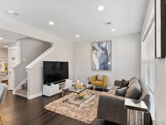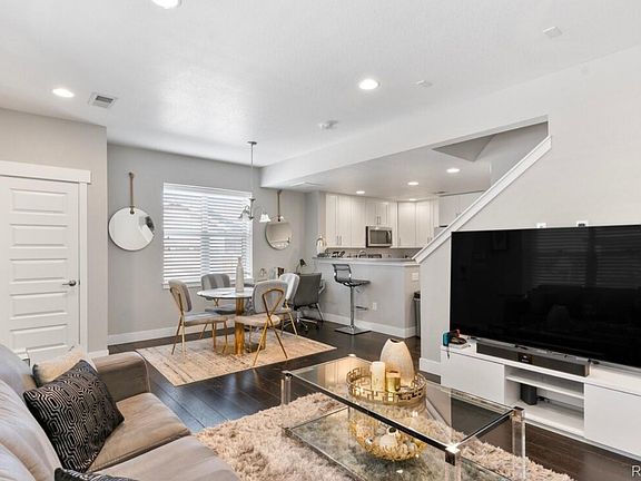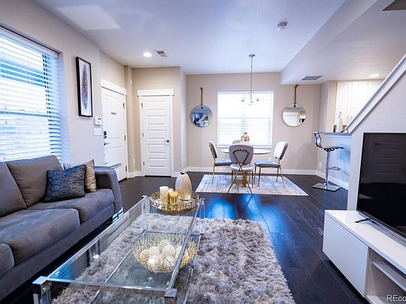 This stunning 2-bedroom, 2-bath townhome is situated in the beautiful Central Park area, just minutes from I-225, light rail, and Stanley Market Place. The open floor plan faces west, filling the space with natural light. The gorgeous kitchen features solid quartz countertops, an elegant backsplash, and stainless steel appliances. Upstairs, you'll find vaulted ceilings, spacious bedrooms with large walk-in closets, and a convenient laundry room. Host gatherings on your covered front porch, and enjoy the extra green space that comes with this end unit. The oversized attached 2-car garage provides plenty of storage. Take advantage of all that Central Park has to offer—don't miss this incredible opportunity!