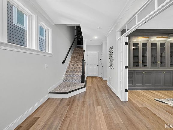 Exquisitely designed and thoughtfully appointed, this nearly new townhome offers 2,464 sq. ft. in the highly desirable Ladue School District. The chef inspired kitchen is a showpiece, featuring 42” cabinets with crown molding, a designer tile backsplash, quartz countertops, and stainless steel appliances. An office with French doors accented by transom glass and built in designer bookshelves provides the perfect work from home space, while luxury lighting enhances the home’s sophisticated ambiance. The living room is bathed in natural light and showcases built in shelving, a window seat, and a custom bar, with an additional built in bookshelf in the stairwell nook for added charm. The primary suite and secondary bedroom both feature coffered ceilings, ensuite baths, and ample closet space, including a walk in closet with custom organizers in the primary. The luxury primary en suite bath offers a walk in shower with elegant tile surround, creating a spa like retreat. Custom millwork, designer finishes, and built in features throughout the home reflect exceptional craftsmanship and attention to detail, combining style, comfort, and functionality in a highly coveted location.