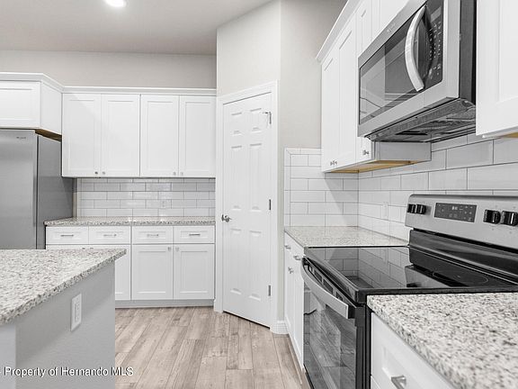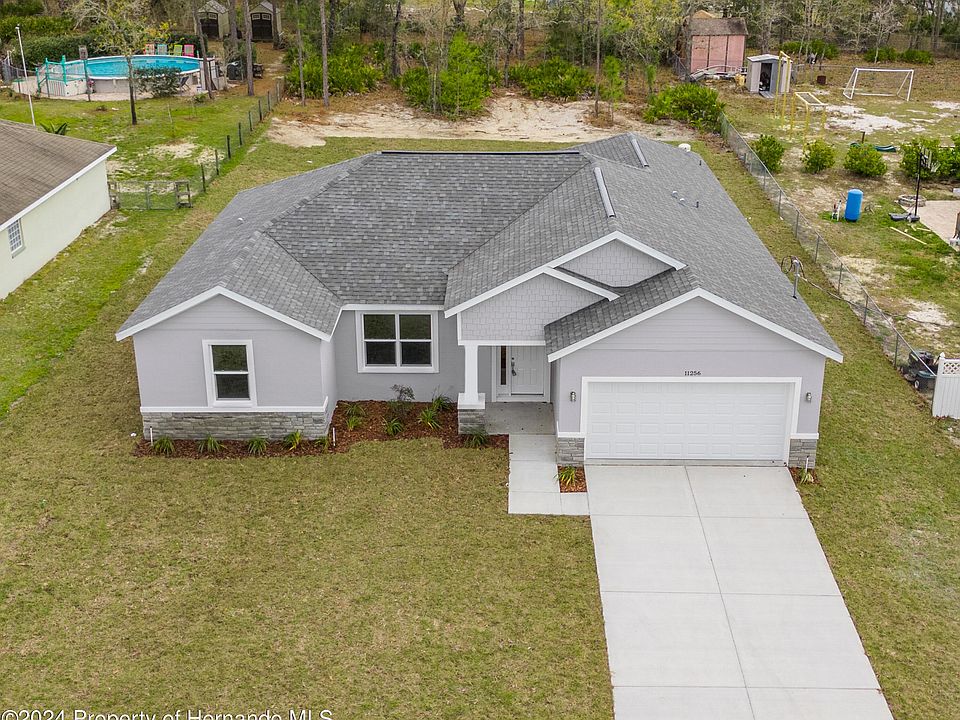 BRAND NEW LUXURY HOME without the year-long wait for it to be built or unknown final cost!! NEW CONSTRUCTION, MOVE-IN READY!! PAVED ROAD! The only thing you need to do is decorate to make it your own!! Offering 3 bedrooms + 2.5 bathrooms + 2 car garage nestled on almost a 1/2 acre in a great location close to shopping and zoned for the county's newest schools (K-12)! This Craftsman-style home with country appeal and stone accents - offers you that southern country feeling! NO HOA! 2,054 sq ft living space; 2,733 total. In the rear of the lot, beyond the backyard, it was left wooded for that extra privacy everyone desires! The stone entry way & front door welcomes you and your guests into the grand center of the home with large open great room, island-style kitchen and dining room all with 10' ceilings! The high ceilings and open space offers you a light, bright, spacious feeling where your family can gather for years to come! Every inch of this custom home is upgraded and attention was paid to every inch and every detail including designer faucets and lighting, upgraded baseboards, upgraded windows/sliders, and continuous Luxury Vinyl Plank flooring throughout the entire home (no carpet)! The upgraded kitchen offers stunning granite countertops with the modern large, single-level island with breakfast bar big enough for the whole family! White upgraded, real wood, shaker-style cabinets with subway backsplash for that finished luxury look and feel. New stainless steal appliances! Generous-sized pantry! The builder's impressive 'Signature Laundry Room' of this custom home will make this your favorite place in the home - you'll take pleasure and pride in organizing your home and family from this amazing space! It offers matching granite counter tops and under-mount sink (instead of a plastic laundry tub), upgraded real wood matching cabinets (with upper cabinets too) with extra countertop and cabinet storage space that RIVALS the kitchen! The home has a split floor plan offering privacy to the owner's suite with large ensuite bathroom! Double doors open up into the private master bedroom with a high tray ceiling and two large walk-in closets! The ensuite bathroom is a SPA RETREAT in itself with a large tiled soaking tub, separate over-sized, floor-to-ceiling tiled walk-in shower and designer shower head and frameless glass door, dual Quartz vanities and dual sinks, matching real wood upgraded cabinets with framed mirrors, designer faucets and lighting, and a separate toilet room for privacy! There is a half bath off the great room for your guests which is also conveniently placed by the door to the garage for the quick access when outside! On the opposite side of the home are the 2 additional generously-sized bedrooms with second full bathroom. Sip your coffee on your large back covered patio in the mornings! Multi-zoned sprinkler system & landscaping! Builder's Warranty provided. Quality Custom Builder. Zoned for the county's newest schools...Winding Waters K-8 and Weeki Wachee High School. NO HOA. NO FLOOD. Located minutes from shopping, restaurants, a hospital, movies, schools, Buccaneer Bay Water Park, kayaking the crystal clear Weeki Wachee River, sunsets at Pine Island, boating, fishing, swimming w/the manatees. 1 hr to Tampa & TOP US BEACHES! Virtual Staging.