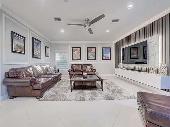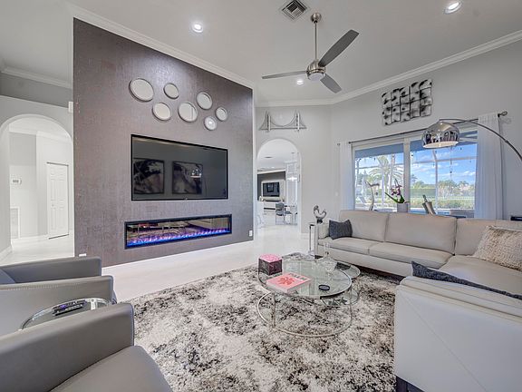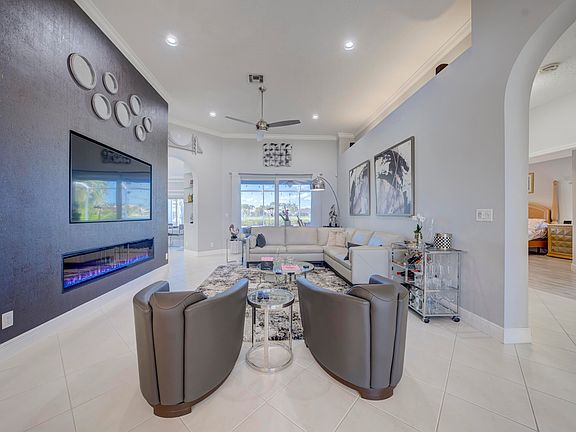 If one is seeking an exceptional luxury home in Wellington, Florida, this residence can be your best solution. Priced under one million dollars, the value of this property can not be matched for the price in consideration of both the featured interior and exterior upgrades. Situated in the well located Grand Isles at Wellington, this home is on a comfortable .30 acre home-site overlooking a rear NW facing wide lake view. Relish in the most incredible sunsets as you wind down at day's end basking in the newly resurfaced free-form diamond bright pool, with new coping tiles, on 2 deck levels, just beyond the screen enclosed patio and lanai At first glance, the curb appeal of this fine home will impress you and your guests by the freshly painted walls and finished (MORE) 3 car driveway, as well as the custom landscaped exterior. A newly installed roof in 2023 should comfort those of concern about the insurance ability and premium cost in the current Florida market. Once inside the home you will be greeted by a great room featuring a captivating beautiful wall inserted custom holographic fireplace. The adjacent newly modernized kitchen features counter to ceiling, lacquer white, custom cabinetry nesting above the quartz white marble toned counters above graphite grey cabinets below. Modern LG stainless appliances and stainless Zepher range hood above LG electric oven and cooktop, enhance the contemporary design. Mini glass subway tiles frame the counter backsplash. The entertainment room features a stunning flat screen TV back lighted mounted to a novel vertical stat wall cover. All 3 of the full baths have been remodeled with stunning light grey 30 X 30 porcelain tile flooring, custom floating under lighted cabinets and exceptional shower and tub wall tiles. Even the laundry room has been remodeled with new cabinets and wet sink. Major appliances such as the A/C and water heater are modern, as well as a wireless alarm system. Consider this incredible opportunity for your next residence today.