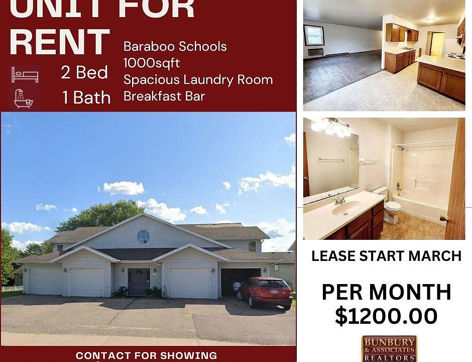 FOR RENT 2 bedrooms, 1 full bath, spacious laundry room, across the street from park, convenient location, pets considered with extra fee, water, trash, lawn, & snow removal INCLUDED! Attached 1-car garage. Available March 1. Must pass background check and credit check.