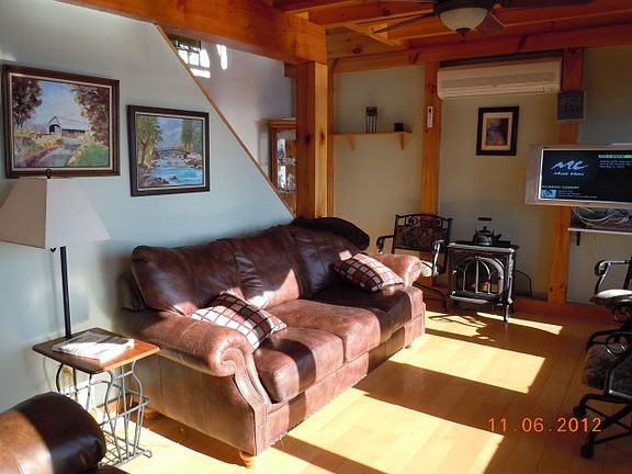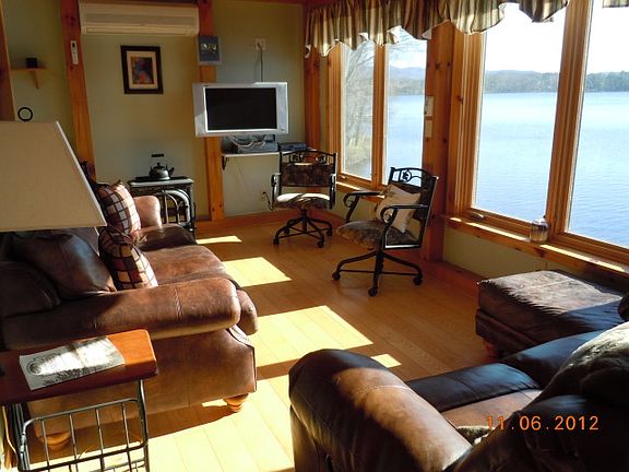 Beautiful Warm 2005 Timberframe! ON THE LAKE. 80'+/- of prime Lake Bomoseen frontage. New build in 2005 with southern exposure facing Neshobe Island. This home has three levels of living area. Main level with bedroom, bath, living room, and full kitchen with stainless steel appliances and corian countertops. Second level with bedroom, full bath equipped with jets and body sprays, and plenty of extra space for a sewing room, recreational room, etc. Basement level with one bedroom, bath, living room, and kitchenette. Basement and main levels have Yodel gas stoves to take the chill off on those cold mornings and evenings. Levelor blinds on all south-facing windows, along with outside awnings