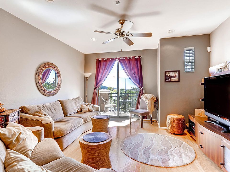 Popular and largest floorplan in the heart of the San Elijo Hills village. Walk to food market, wine bar, pizza, schools, parks, trails and more. Entry level bedroom/full bathroom. Big, open, modern living level with tons of light. Kitchen features granite counters & stainless steel/black appliances. Wood flooring, carpet and tile. Laundry conveniently located near bedrooms. AC. 2 car side by side garage. Sunny south westerly oriented balcony. Desirable location in complex with open area in front of unit.