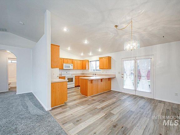 Tucked away on a secluded dead-end street, in a prime NW Meridian area, offering easy access to shopping, dining, and entertainment. Situated on a spacious lot, this immaculately kept residence combines comfort & practicality seamlessly. Soaring vaulted ceilings span the living spaces, creating a welcoming and spacious atmosphere with recently updated flooring throughout. Thoughtfully designed with a split-bedroom layout, this home ensures both privacy and convenience. The generously sized kitchen offers abundant storage, a breakfast bar, and an eat-in dining area. The east-facing backyard features a spacious covered patio and ample green space, making it an ideal spot for outdoor activities and relaxation.