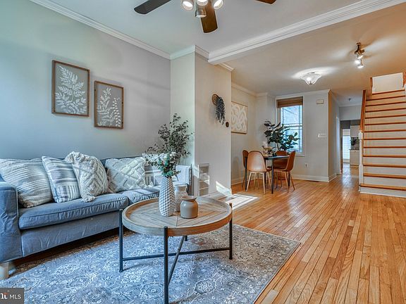Well maintained rowhome with COVERED PARKING in a prime location of Canton. This 2 bed 1.5 bath home features an open front layout with well defined living and dining spaces, exposed brick, light colored hardwood floors, fresh paint and upgraded blinds throughout. Enjoy a modern kitchen with white cabinets, upgraded hardware, stainless steel appliances and single deep sink. The main level finishes out with a convenient stackable laundry and rear half bath with new vanity and fixtures. Upstairs you will find the primary bedroom to the front of home with two large closets and a rear bedroom to the rear with 1/2 brickwall and tons of natural light. The full bath splits the rooms with granite a vanity, backsplash and bonus linen closet. The exterior showcases a rear covered parking pad with hardwired automatic door opener, privacy fence and a spiral staircase leading you up to an over-sized composite deck perfect for entertaining. One of the best blocks Canton has to offer, close to local bars and shops with easy access to 95 and 895. Set up a showing today!