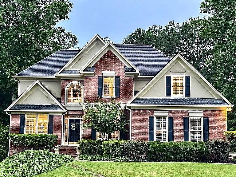 Come check out this entertainer’s dream yard! Fantastic 3-sided brick home in the upscale Estates at Wellington with three levels of finished space. Four bedrooms on the top floor including master suite with trey ceiling in the bedroom, glass shower in the master bath with double sinks and jetted tub, and walk-in closet. Three other bedrooms share the other full bath upstairs with double sinks and separate toilet and shower with skylight. The top floor is carpeted with original hardwoods underneath that match the main level. Main floor features a two-story foyer with views of the overhead balcony, as well as formal living and dining rooms that open to a beautiful two-story family room. Huge kitchen with granite, back splash, and upgraded stainless steel appliances including double ovens, microwave and quiet Bosch dishwasher. Spacious laundry room and half-bath near the attached 2-car side-entry garage. Finished basement with Berber carpet throughout has two additional bedrooms with full bathroom that can be used as a mother-in-law suite for your guests visiting short or long-term. And there is a great family room set up as a movie room with 100” motorized Elite projector screen, large custom floating projector shelf, built in surround sound speakers and wiring plus built-in shelves for additional entertainment or game area. There is TONS of storage for toys, games, supplies, outdoor equipment, etc in multiple large closets as well as a tool room with separate entrance from the outside. Then you can NOT miss the incredible private back yard with something for everyone. This yard is featured by StarPro Greens for its 32’x19’ 5-hole putting green with a huge custom fire pit and patio, as well as a trampoline. Friday night s’mores with neighbors, Sunday night tailgates, birthday and graduation parties - you name it, this space is perfect for it. The large deck overlooking this flat backyard is freshly replaced and ready for your next barbecue. Estates at Wellington offers an active swim & tennis lifestyle in Johns Creek in highly sought after schools, the #1 Best Place to Live in 2025 as ranked by US News & World Report!