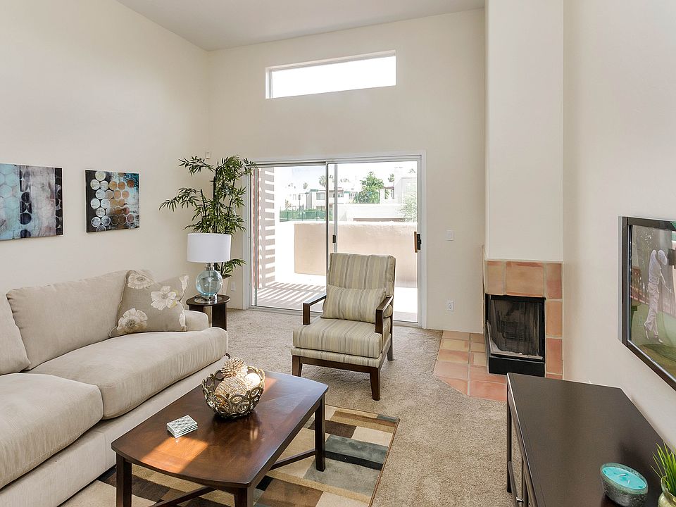 Luxury resort style condominium located in prestigious North Scottsdale. Surrounded by mature landscaping and flowing fountains, this place is a must see. This open, airy, 2 bedroom, 2 bathroom, split floor plan is over 1500 sq. ft! INTERIOR FEATURES: High ceilings, fire place in living room, dining room, eating area in kitchen, generous bedrooms, master has pool view, master bathroom with dual sinks, fresh carpet and paint. Interior access to garage. EXTERIOR FEATURES: north facing balcony overlooking fountains and pool (perfect for evenings), access to balcony through living room, and access to balcony by master bedroom. COMPLEX FEATURES: 2 heated pools, hot tubs, tennis court, clubhouse, grilling stations, and a workout facility. This is an end unit with no neighbors above, a true urban desert retreat, which offers complete serenity. Call Katie (480-221-6354) for an appointment today!