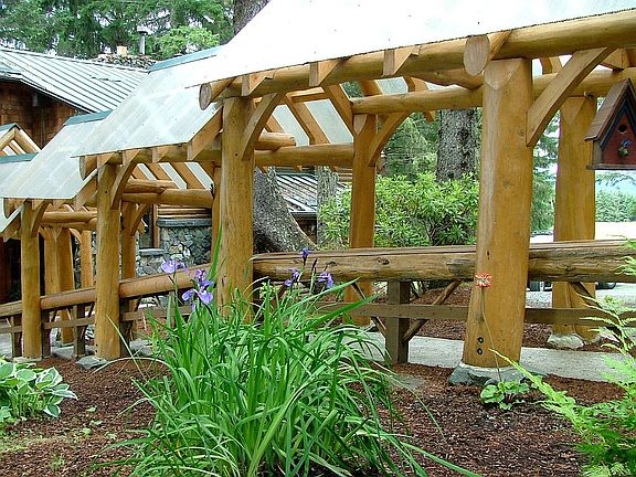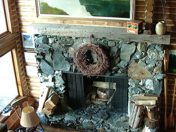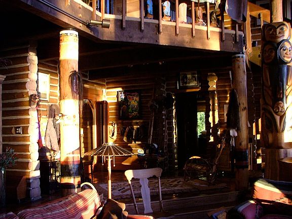 Alaskan lodge style home of rock ,log open beam ceilings with custom craftman detail. large windows with views of the Chilcats mt. range .Home beach frontage so views of islands situated on 1 ac. beach lot but surrounded by additional 8 ac. of owners forrest and adjoining city owned wilderness park of about 20 ac. 2 garages- 2 car attached + 3 car un-attached two story carriage house style garage 740 sq ft garage floor with upper floor wood panneling on ceiling & walls about 600sq ft