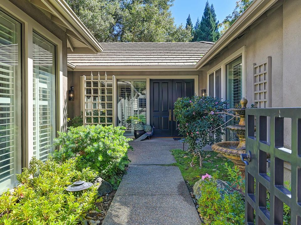 Highly sought-after Crocker Grove! Rarely available single-story home featuring 3 bedrooms plus a junior suite with separate entrance to 4th bedroom and full bath ideal for guests or multigenerational living. A welcoming courtyard and beautiful grounds set the tone for this beautifully maintained home. Enjoy formal living and dining room, and a separate family room/sitting area with a second fireplace, offering multiple spaces to relax and entertain. Abundant windows and French doors fill the home with natural light and views of the peaceful, well-tended landscape. The kitchen features granite counters, an island with gas cooktop and griddle, a built-in refrigerator (2018), and double ovens. The primary suite offers patio access and a luxurious bath with dual sinks, large soaking tub, and spacious shower. Additional highlights include recessed lighting, fireplace inserts, gutter guards, and a newer HVAC and water heater (2022). Washer & dryer (2025) included. Relax in the backyard with covered patio, deck, and water feature. HOA covers front yard care, exterior paint, streets, gate, and security - offering elegance, comfort, and peace of mind in one of the area's most desirable neighborhoods.