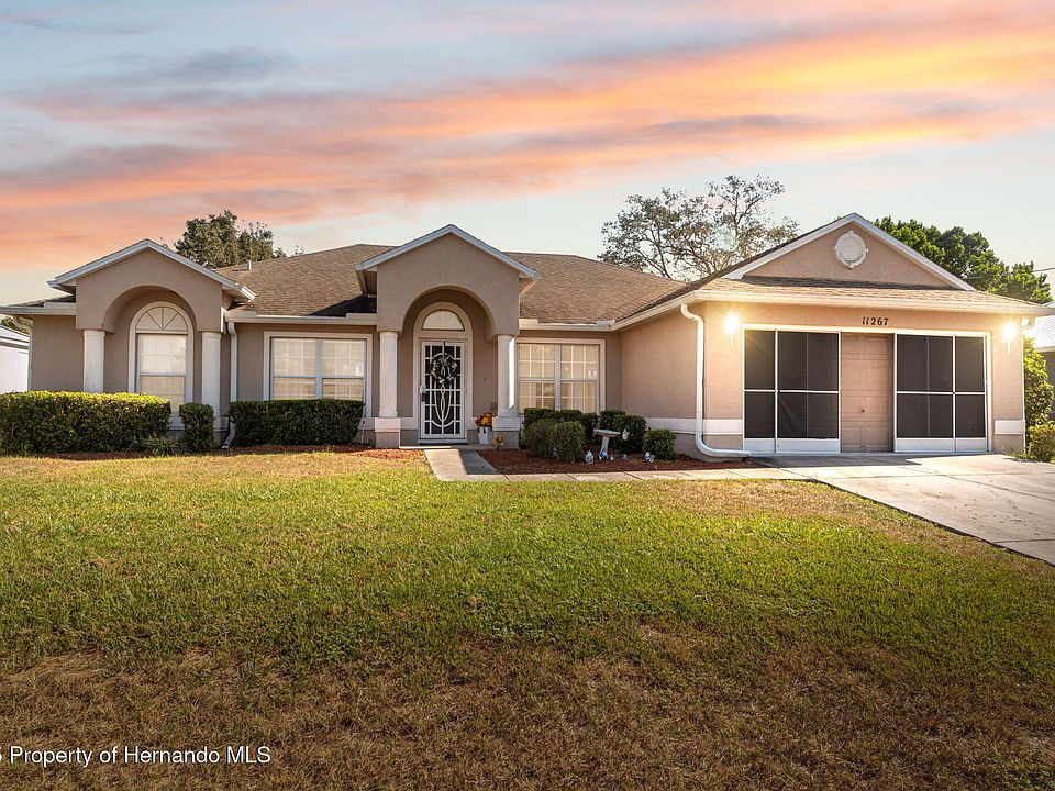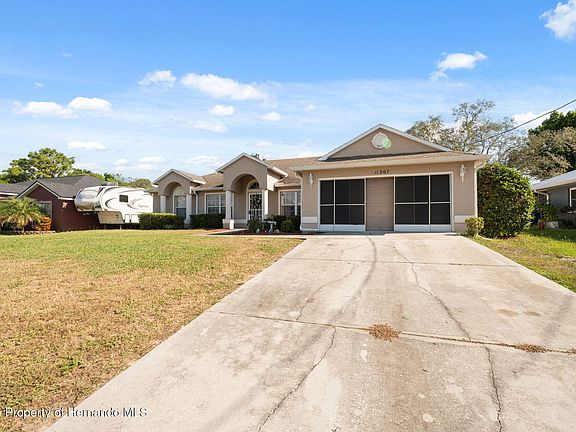 This inviting single-story home with a new HVAC system blends traditional design with thoughtful details, offering 4 bedrooms, 2 bathrooms, and a 2-car garage. A concrete driveway leads to a screened-in garage and arched entryway with decorative columns, setting the tone for the warm interior. Inside, the foyer welcomes you with tall architectural columns that open to a spacious, light-filled floor plan where the dining room, living room, and main gathering space connect seamlessly. The dining area on the right side features a chandelier and breakfast bar, while the main living room is the heart of the home with large windows, sliding glass doors, and recessed lighting, creating the perfect atmosphere for both entertaining and relaxing. The kitchen offers timeless functionality with wood cabinetry, stainless steel appliances, decorative shelving, and a breakfast bar for casual dining, complemented by the adjacent breakfast nook overlooking the sunroom. The primary suite on the left side is a retreat of its own with multiple windows, a walk-in closet, and an en suite bath featuring double vanities, a soaking tub with tiled surround, and a separate glass-enclosed shower. The second bathroom is equally well-appointed with a wide vanity, natural wood cabinetry, framed mirror with lighting, decorative shelving, and a tub-shower combo illuminated by natural light. The additional bedrooms provide versatility with walk-in closets, ceiling fans, and layouts that adapt to family needs, guest accommodations, or office space. Expansive sliding doors lead to the screened-in sun room, a true extension of the living space where durable concrete flooring, a flat finished ceiling, and full-height screened panels create a comfortable space for year-round enjoyment—ideal for exercise equipment, outdoor dining, or simply relaxing with a view of the fenced backyard. Outside, mature trees and open grassy areas provide privacy and shade, while a storage shed adds convenience for tools or lawn equipment, and there's ample room for gardening, play, or even the addition of a pool. The home's location offers both tranquility and accessibility, just 6 miles from the Suncoast Expressway, making commutes to Tampa and surrounding areas simple and efficient. Local attractions include Weeki Wachee Springs State Park (8 miles), famous for its crystal-clear waters, kayaking, and manatee sightings; Hernando Beach (12 miles), a scenic gateway to the Gulf of Mexico with boating and fresh seafood dining; and The Nature Coast Botanical Gardens (5 miles), where walking paths and themed gardens create a serene retreat. With a blend of comfort, space, and convenience, this home is designed to support both everyday living and memorable moments, making it a place you'll love coming home to.