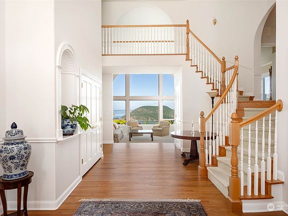 Perched atop a private hillside sits this custom-built home offering unparalleled views of the San Juan Islands and the Olympic Mountains. Vaulted ceilings and expansive windows fill the living spaces with natural light, blending the home’s architecture seamlessly with the outdoors. The spacious primary suite features marble finishes, dual vanities, a soaking tub, two closets, a private deck, and a large office. Additional amenities include a dream kitchen with a butler's pantry and wet bar, formal dining, a breakfast nook, custom fireplaces, functional built-ins, and beautiful millwork. A cobblestone path winds through the garden hillside to a secluded reflection bench. Catch every sunset and indulge your senses with this timeless estate.