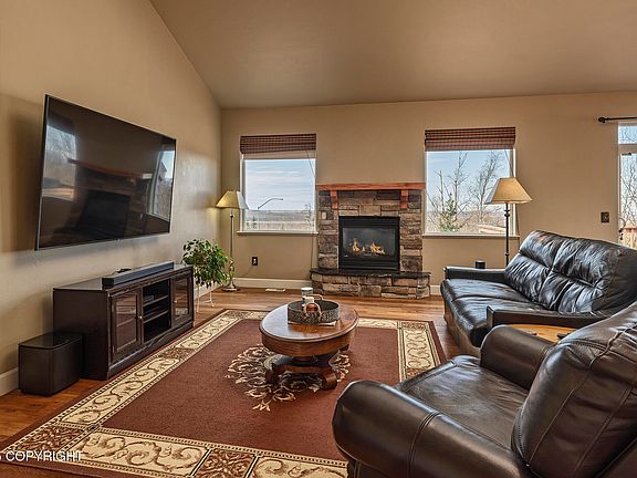 Custom Michael Quinn build on OVER an ACRE with mountain views in Eagle River! This home feels special as soon as you enter the front door. Wood beams, solid wood doors, brushed granite, hickory cabinets, and hardwood floors are just some of the higher end finishes that give this home both a sophisticated and warm, Alaskan feel. Located in Roseberry Estates, this 4 bed (+office), 3 (SEE MORE)bath home has an open concept kitchen and main living area, and an additional living space downstairs. The deck provides a gas grill stub out. 4-car tandem garage will accomodate full-sized vehicles and Alaskan toys. It also houses a sauna for warming up on chilly days. Outside, pride of ownership shows with newer exterior paint and the rock retaining wall that's been added to expand the parking area (roomy enough for a boat, RV, and other vehicles), also home to a 14X28 storage building with electric and loft areas. Yard is fully fenced, with beautiful landscaping, a gazebo and fire pit area, chicken coop, and hot tub! This home has Air Conditioning, a rare amenity for Alaska but nice to have on those warmer summer days! There's even a 9000W generator with house shut off as well. All of this, and it's a quick drive to all of Eagle River's amenities.
