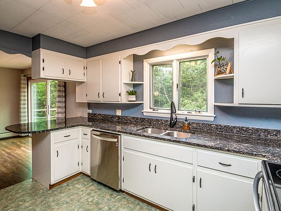 Welcome home! Come see this lovely 3 bedroom, 2 bath ranch in Madison, one floor living, with a 2 car garage. It would make a wonderful primary home, or a fantastic vacation property. This home is set back on 1.2 acres with loads of private space and many updates. The kitchen was tastefully renovated in 2023, complete with granite countertops and new appliances. New windows throughout as well as a dining room slider, new oil boiler and hot water tank, 1/2 bath was re-done, & radon mitigation system installed. Gather around the fireplace with a lovely brick hearth after a day of skiing. Sit out back on the beautiful new deck and enjoy your delightful backyard and the sounds of nature. Full unfinished basement with an additional wood stove for heat. Adorable screened in space between home and garage, means you can chill out and avoid the bugs and also stay dry in winter. The two car garage brings extra storage space and convenience. 15 minutes to North Conway, and close to everything the Mount Washington Valley has to offer.