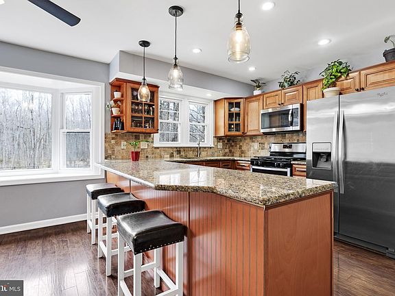 Situated on 8 acres right across the street from Nockamixon State Park, this updated 4 bed/3bath home is ready and waiting for you. As you enter the home, the living room is filled with sunlight, built-in cabinetry, and hardwood floors that continue through much of the main level. Continue into the large eat-in kitchen with granite countertops and stainless steel appliances that leads to a formal dining room with views of the expansive backyard. Relax by the wood burning stove in the family room with exposed beams and plenty of natural light. The large, bright sunroom leads to a deck and a fenced in backyard that is perfect for entertaining as it overlooks the beautiful wooded lot. A full bath, garage access, and laundry area complete the first floor. Upstairs, you will find a large master bedroom with hardwood floors, huge walk-in closet, and large master bath with double sinks and marble countertops. Three additional bedrooms with plenty of closet space, and an updated full bath complete the second floor. Plenty of additional storage space available in the full basement, and convenient access to major roads. Schedule your showing today!