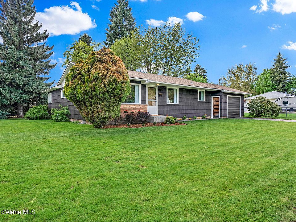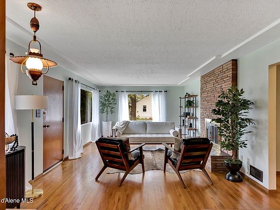 beautifully preserved original hardwood floors, a new roof installed in 2022, and fresh exterior paint completed in 2023. Incredible bones provide the perfect canvas for a new owner to maximize this charming home's full potential. Floods of natural light highlight the mid-century modern styling of the living room through large picture windows. Custom woodwork adorns the basement rec room with tongue and groove wood paneling and hand-crafted built-ins in the laundry room. Year round comfort is provided by central A/C and gas forced air, a gas fireplace in the living room, and a wood-burning stove downstairs. Resting on a large corner lot with a fully fenced backyard and automatic sprinkler system. Enjoy a heated 26x22 shop and a single-car attached garage. Centrally located just a mile north of downtown CDA and quick access to I-90